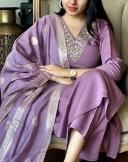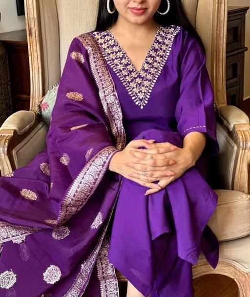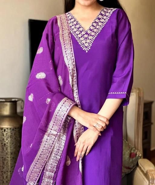 Name: Women's Violet Colour Rayon Slub V-neck Embroidered Straight Kurta Pant with Dupatta sat