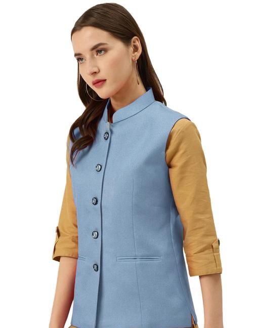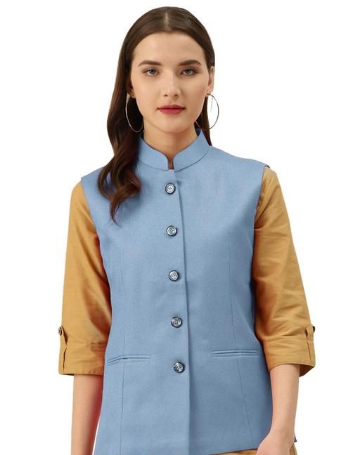 Nehru Jackets enhance the look for all occasions! Be it get-together, weddings, party, dinner dates or a casual met up, dress up in these precisely crafted jackets that come in a mix of royal colours, finest fabric, Well fitted and elegant. Paired with Kurta, suit or Formal Trousers. This Women Nehru jacket Featuring contrasting buttons on the placket, welt pockets and a simplistic design.