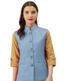 Nehru Jackets enhance the look for all occasions! Be it get-together, weddings, party, dinner dates or a casual met up, dress up in these precisely crafted jackets that come in a mix of royal colours, finest Wool fabric, Well fitted and elegant. Paired with Kurta, suit or Formal Trousers. This Women Nehru jacket Featuring contrasting buttons on the placket, welt pockets and a simplistic design.