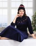 MEGH-NIGHT Womens and Girls Full Length Embroidery Velvet-Woolen Nighty For Winter-Nightdress-Sleep And Lounge wear-Navy-Blue