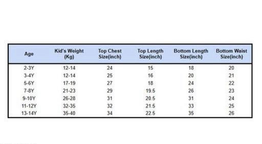 8-9 Years (Top Chest Size: 10 in, Top Length Size: 10 in, Bottom Waist Size: 10 in, Bottom Length Size: 10 in)