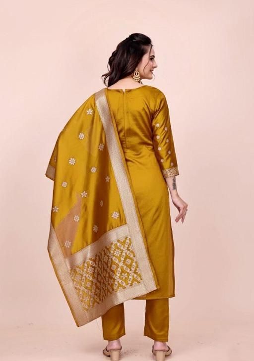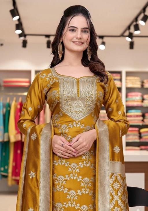 In this product suit fabric 2.20 meters bottom fabric 2.00 meters dupatta fabric 2.00 to 2.25 meters are provided This cloth is made from art silk fabric.