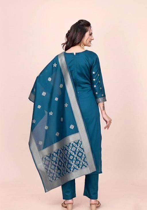In this product suit fabric 2.20 meters bottom fabric 2.00 meters dupatta fabric 2.00 to 2.25 meters are provided This cloth is made from art silk fabric.