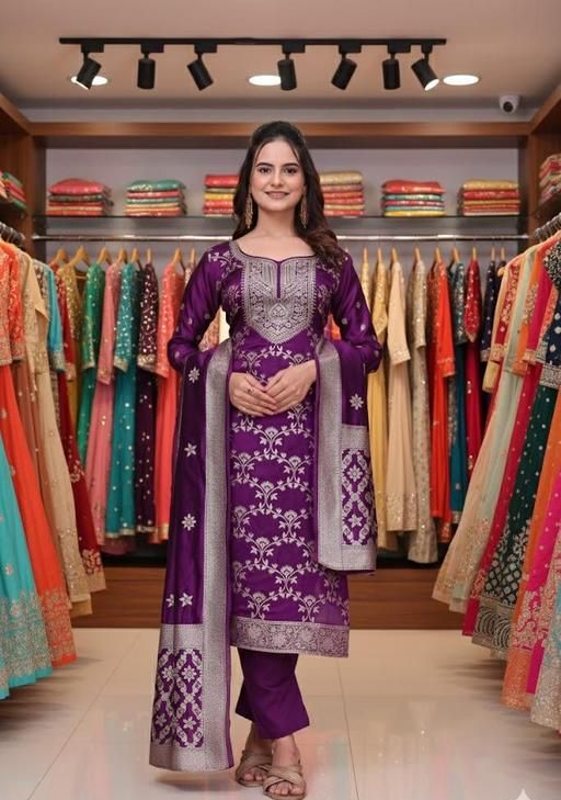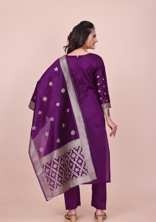 In this product suit fabric 2.20 meters bottom fabric 2.00 meters dupatta fabric 2.00 to 2.25 meters are provided This cloth is made from art silk fabric.