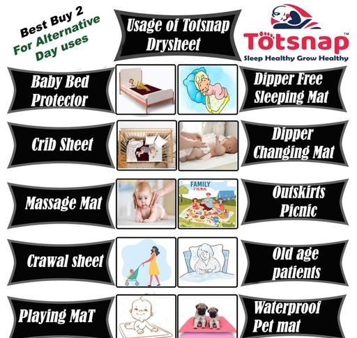 Totsnap® Baby Drysheet is 100%Reusable, Premium quality Dry Sheet / baby Urine sheet Dry Sheet , Machine Washable lightweight portable, easy to carry and handle. Absorbs more water and dries faster (non-water resistance side). Freedom to enjoy undisrupted sleep for a longer period It provides superior protection against Bed wetting toilet training for kids, Pet saliva drolly ideal for indoor pets, Body fluid discharge ideal for day menstrual flow, Urinary incontinence ideal for elderly patients.