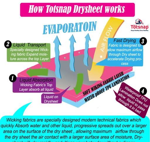 Totsnap Baby dry sheet is a by-layer product with an upper layer highly absorbent surface made out of soft & cosy specially designed Wicking fabric which quickly absorbs water and other liquids. Progress spreads out over a larger area on the surface , allowing maximum airflow through the drysheet , air contacts with a larger surface area of moisture makes Drysheet will dry rapidly and laminated beneath layer membrane is of 100 % leak proof breathable material which does not allow liquid to pass through it in bed mattress and help in drier faster.