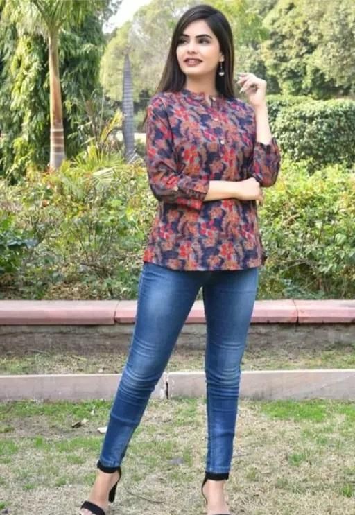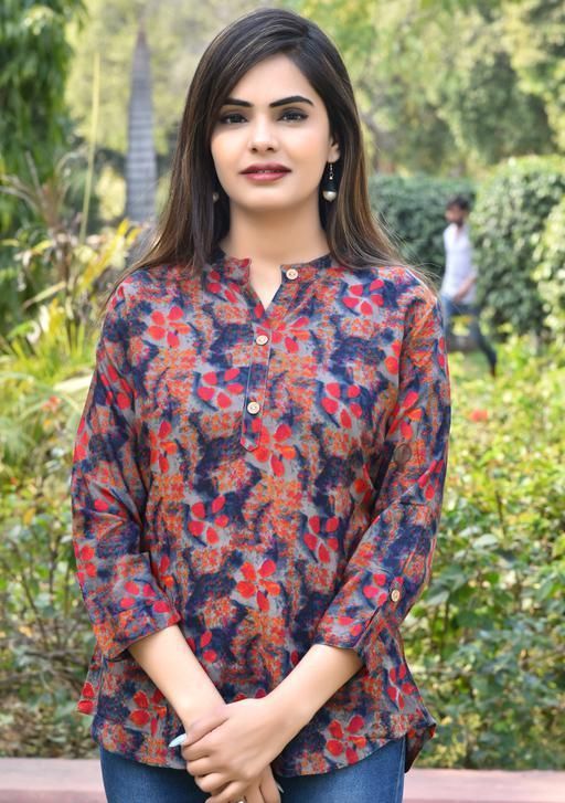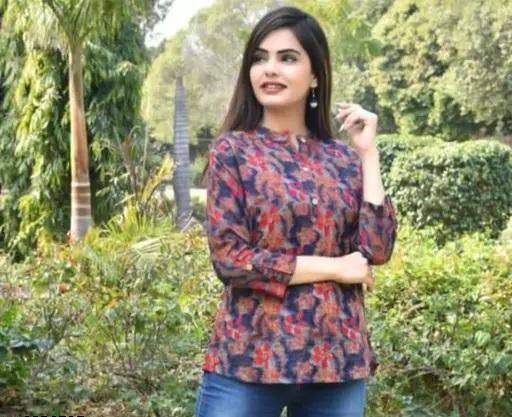 Name: m-trusted Women's fashion Floral Printed attractive Navy Blue Red flower Rayon Top top shirt style top for women with three quarter sleeves western top for women and girls Cotton/Rayon tops ,Tops, Tops for summer for women, tops on jeans, tops n tunics,toper, printed women shirt