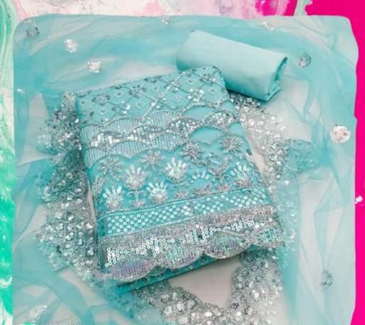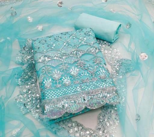 Name: NET SUITS Unstiched Wedding Wear Heavy sequinned Work Wear Suit Like Party Wear solid Unstitched Net Suit with Exquisite Sequin Work Women's PAKISTANI SUIT FOR WOMENS Double Embroidered Work Plus Double Salwar Suit & Dress Materials Aqua Blue Colours
