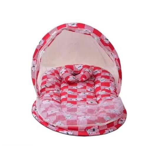 Name: Premium Baby Bedding Set with Mosquito Net and Neck Pillow – Soft Cotton, Red Teddy Print