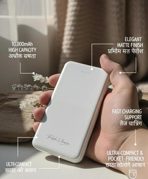 Capicity : 10,000 mAh Battery Fast Charging Colour: White Output Pots : 4 WITH 1 CATA CABLE PREMIUM LOOK SLEEK & COMFORT SIZE Smart LED
