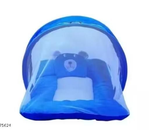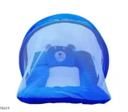 Royal Blue Bear Set: Features a solid royal blue and white design with a bear-themed pillow. This model has a sleek, continuous mesh canopy for maximum visibility.