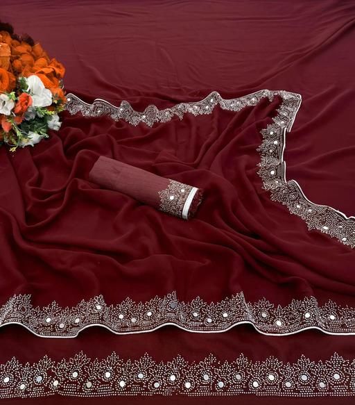 a premium georgette saree featuring intricate white stone or hotfix work along the border and pallu. It is typically marketed as a designer party or festive wear item, combining a lightweight drape with glamorous detailing.