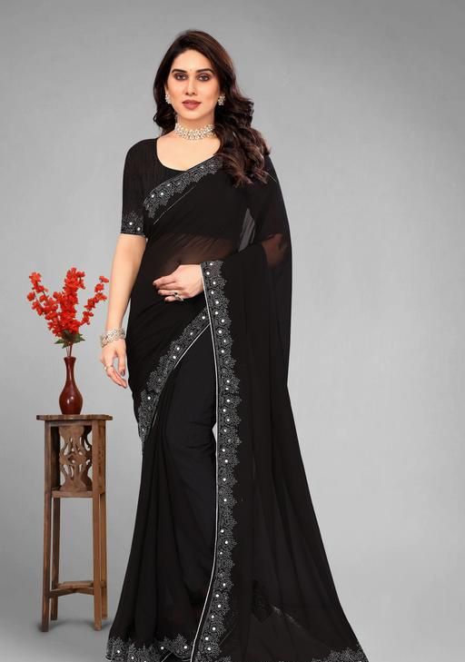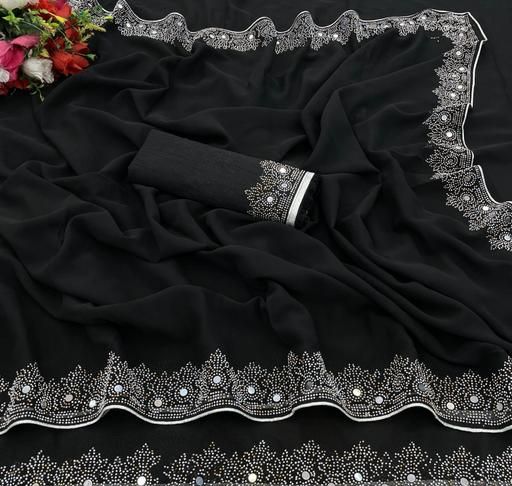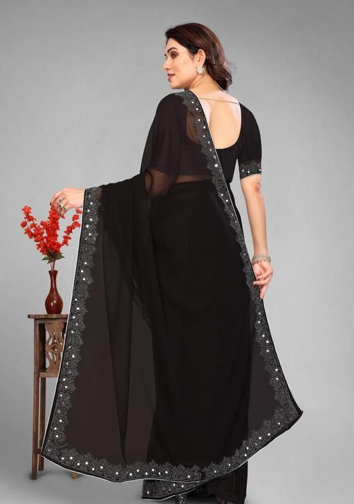 a premium georgette saree featuring intricate white stone or hotfix work along the border and pallu. It is typically marketed as a designer party or festive wear item, combining a lightweight drape with glamorous detailing.