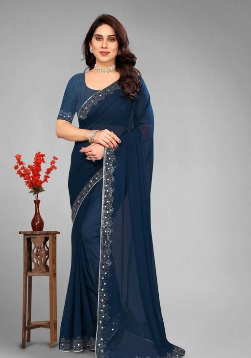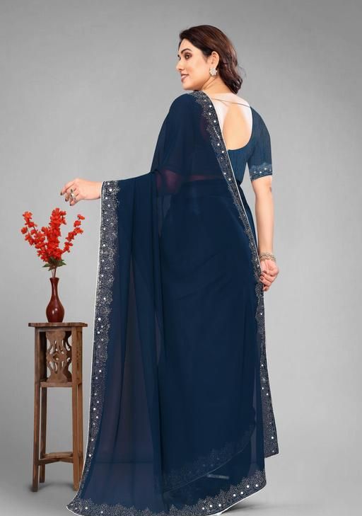 a premium georgette saree featuring intricate white stone or hotfix work along the border and pallu. It is typically marketed as a designer party or festive wear item, combining a lightweight drape with glamorous detailing.