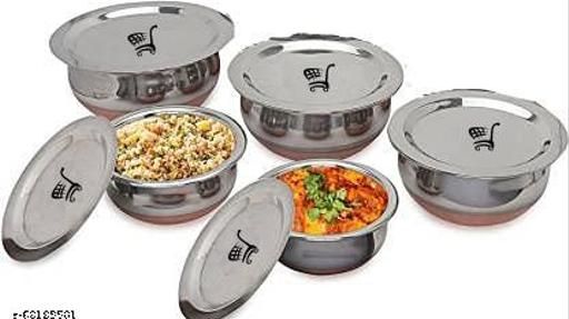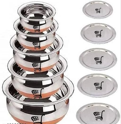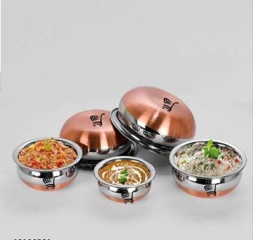 MATERIAL :- Copper Bottom. Premium Quality Mirror Finish Stainless Steel Deep Vessel /Handi / Cooking Pot For Kitchen. Export Quality Stainless Steel Making The Utensil Highly Durable, Long Lasting & Rust Free. Giving It A Long Live, Keeping It Beautiful For Years /Generations. Less Stain Steel Cookware. Capacities of 450ML ,650Ml, 850ML, 1400ML, 1600Ml pack of 5. Package Contents Five Piece Of Copper Bottom Handi Sets Easy to clean and wash, Durable as a daily serve ware set DESIGN :- These Classy Copper Bottom Handi with lid Are Is Only Attractive To Look But Also Has A Very Large Capacity. They Can Be Used Not Only To Cook Food, But At The Same Time Due To Their High Storage Space And Attractive Looks, You Can Use Them As Cookware As Well As Serveware On Your Table Top. USE :- Ideal For Daily Use On Your Gas Stove. Energy Efficient. Heats Evenly And Cooks Faster. Food Will Not Stick To Your Pan. EASY TO HANDLE :- Compact Size Makes It Easy To Store In Kitchen Cupboards. Easy To Clean & Maintain.