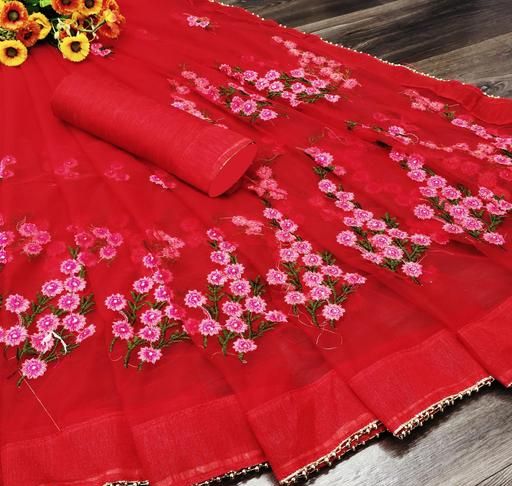 "CHHELAJI" Attractive Soft Net Floral Embroidery Saree Decorated With Moti Lace And Unstitched Art Silk Blouse Piece