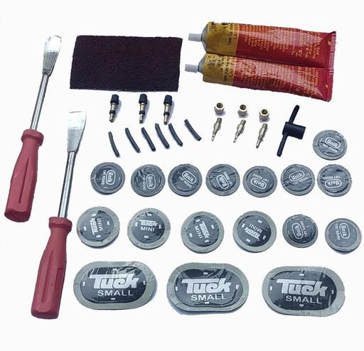 Full packed in transparent bag with zipper complete cycle puncture repairing kit for tube tyres 35 pcs, And stainless steel tyre levers for all type of road cycles.(For only tube included tyres) For cycling enthusiasts, who loves to do it themselves: 7inches long tyre removing levers(2 pcs), Long life Puncture patches (10 pcs), puncture patches mini ropund(4 pcs), puncture patches big size(3 pcs) Pasting solution- 2 pcs(50ML), Tyre patches bigger (4 Pcs), Emery paper/Heavy sand paper 2"×4"- (1pc), Tube valve(internal)- 6 piece, Metal valve -6 piece Valve cap - 6 piece, valve dia-1pc(heavy)