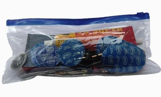 Full packed in transparent bag with zipper complete cycle puncture repairing kit for tube tyres 35 pcs, And stainless steel tyre levers for all type of road cycles.(For only tube included tyres) For cycling enthusiasts, who loves to do it themselves: 7inches long tyre removing levers(2 pcs), Long life Puncture patches (10 pcs), puncture patches mini ropund(4 pcs), puncture patches big size(3 pcs) Pasting solution- 2 pcs(50ML), Tyre patches bigger (4 Pcs), Emery paper/Heavy sand paper 2"×4"- (1pc), Tube valve(internal)- 6 piece, Metal valve -6 piece Valve cap - 6 piece, valve dia-1pc(heavy)