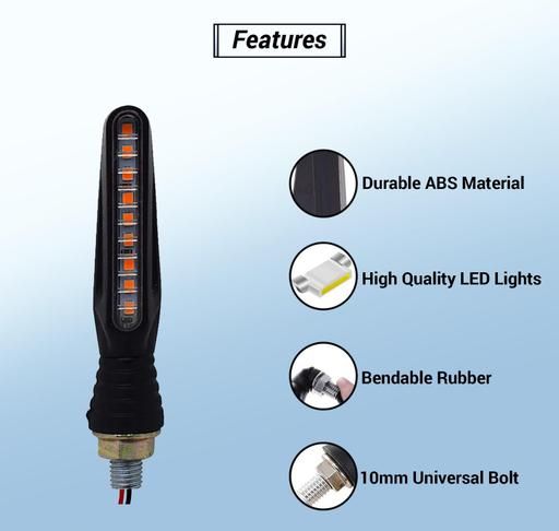 Bike Signal Light has Stylish shape, can catch more people's eyes on the road, makes your motorcycle more fashionable.It is made of ABS plastic body which durable to use.9-LED, Less power consumption, 80% less power consumption than ordinary energy-saving lamps of the same brightness.High toughness bendable rubber to prevent accidental falls effectively.It has igh brightness, low light failure, stable performance and long life.