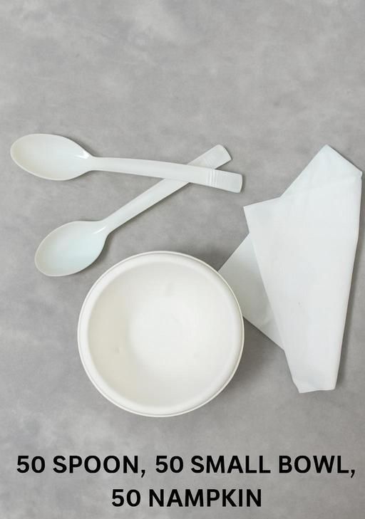 Upgrade your dining experience with this Disposable Bowl & Spoon Combo Pack – perfect for parties, events, catering, or everyday convenience. Each set includes 50 durable white bowls and 50 sturdy white spoons 50 off white Napkin , designed to provide a hygienic, hassle-free solution for serving food.Crafted from lightweight yet reliable plastic, these bowls and spoons are ideal for both hot and cold dishes. The clean white design complements any occasion, while the disposable nature ensures quick cleanup after use. Whether you’re hosting a family gathering, organizing a community event, or stocking up for your business, this combo pack delivers practicality and value. Complete Set: 50 bowls + 50 spoons.Durable & Lightweight: Made from high-quality disposable plasticVersatile Use: Suitable for parties, picnics, catering, and takeaways Hygienic & Convenient: Single-use design for easy cleanup- Neutral White Design:
