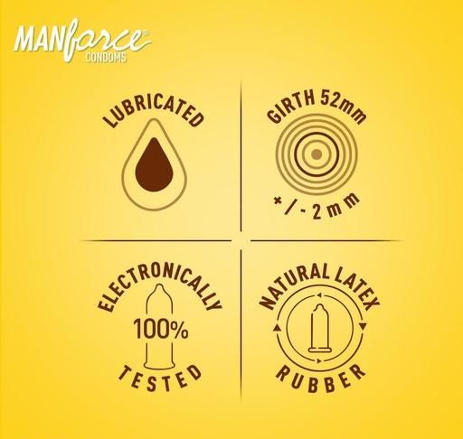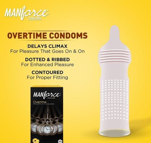 Tropical Treats for a thrilling new sexual experience. Fulfill your sweet fantasies with Manforce Overtime Condoms 3 in 1 Condoms that tease the senses with some fruity and juicy explosion of flavours. Ribbed, contour and dotted condoms work wonders during lovemaking with added advantage of Benzocaine oil which will make him go on and on for longer. With a girth of 53 mm +/-2mm and length of 180 mm, the natural latex rubber condoms by Manforce provide a better fit to unveil your wild side during sex. Each dotted condom is 100% electronically tested to ensure a high level of protection. This long- lasting condom is India?s No.1 condom, giving you the confidence of building a deep and intense connection with your partner. Usage: For single use only. Read the pack for full instructions before use. Storage: Store in a cool dry place away from the heat and direct sunlight.