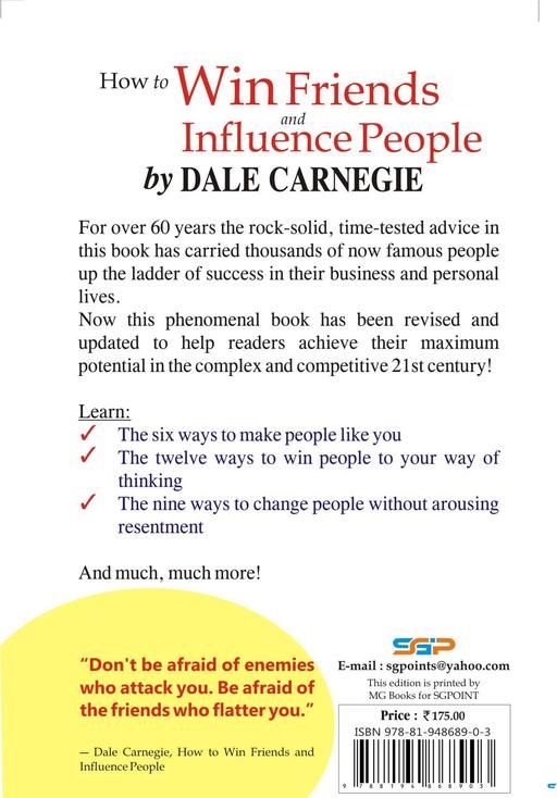 How to Win Friends and Influence People How to Win Friends and Influence People is one of the first best-selling self-help books ever published. Written by Dale Carnegie and first published in 1936, it has sold 15 million copies world-wide. Still as vibrant and helpful as the day it was written it offers a simple set of guidelines, lucidly explained, that will enable every reader gain insights into being Popular, Persuasive, Influential and Happy in all of his or her relationships.