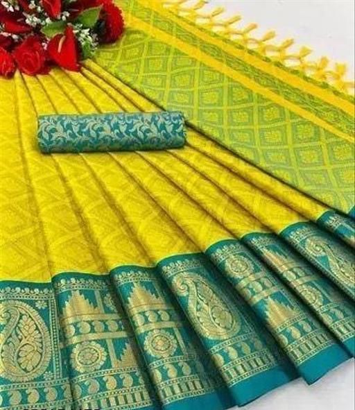 Design and Work: It features intricate woven patterns and a rich zari border with traditional motifs, including a jaal design. The golden zari work adds an opulent and grand touch.