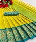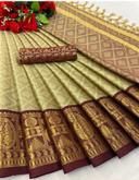 The image displays a beautiful Kanjivaram silk saree with intricate details.
