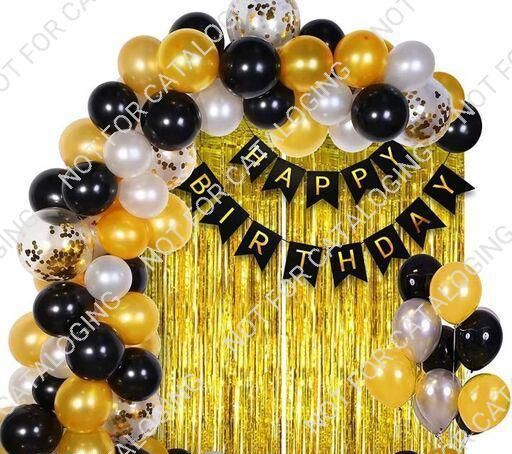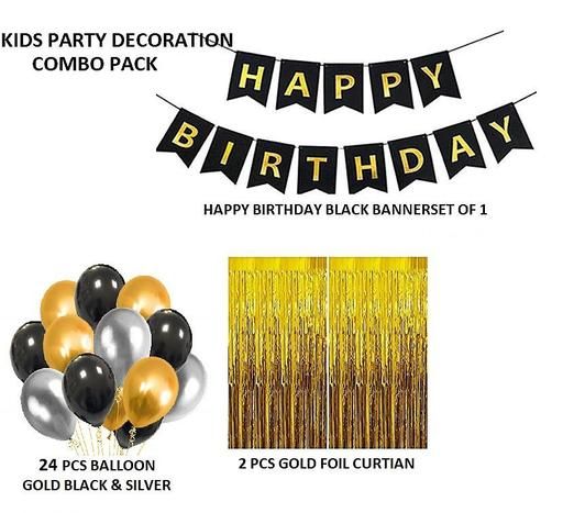 Name: Happy Birthday Black Banner + 24 Pcs Of Black,Silver,Golden Balloons + 2 Pcs Of Golden Fringe Curtains