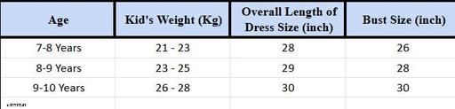 3-4 Years, 4-5 Years, 5-6 Years, 6-7 Years, 7-8 Years (Bust Size: 26 in, Length Size: 28 in)