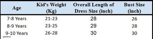 3-4 Years, 4-5 Years, 5-6 Years, 6-7 Years, 7-8 Years (Length Size: 28 in, Bust Size: 26 in)